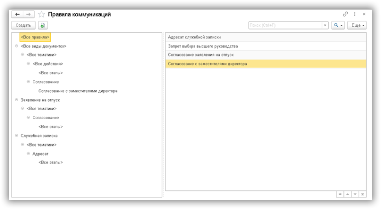 Активировать функционал можно в настройках системы 1С. Для этого перейдите в «настройки», затем в «Настройки программы», затем в «Процессы и задачи» и активируйте галочкой «Использовать правила коммуникаций». Все настроенные основные правила коммуникаций вы найдете в меню раздела «НСИ» по команде «Правила коммуникаций». src="https://dokumentooborot24.ru/wp-content/uploads/2022/11/soglasovanie-s-zamestitelem-direktora.png&am...; height="440" srcset="https://dokumentooborot24.ru/wp-content/uploads/2022/11/soglasovanie-s-zamestitelem-direktora.png 813w, https://dokumentooborot24.ru/wp-content/uploads/2022/11/soglasovanie-s-zamestitelem-direktora-300x16... 300w, https://dokumentooborot24.ru/wp-content/uploads/2022/11/soglasovanie-s-zamestitelem-direktora-768x42... 768w" sizes="(max-width: 800px) 100vw, 800px">Настройка правил доступна либо Администратору системы 1С, либо пользователю, ответственному за НСИ.