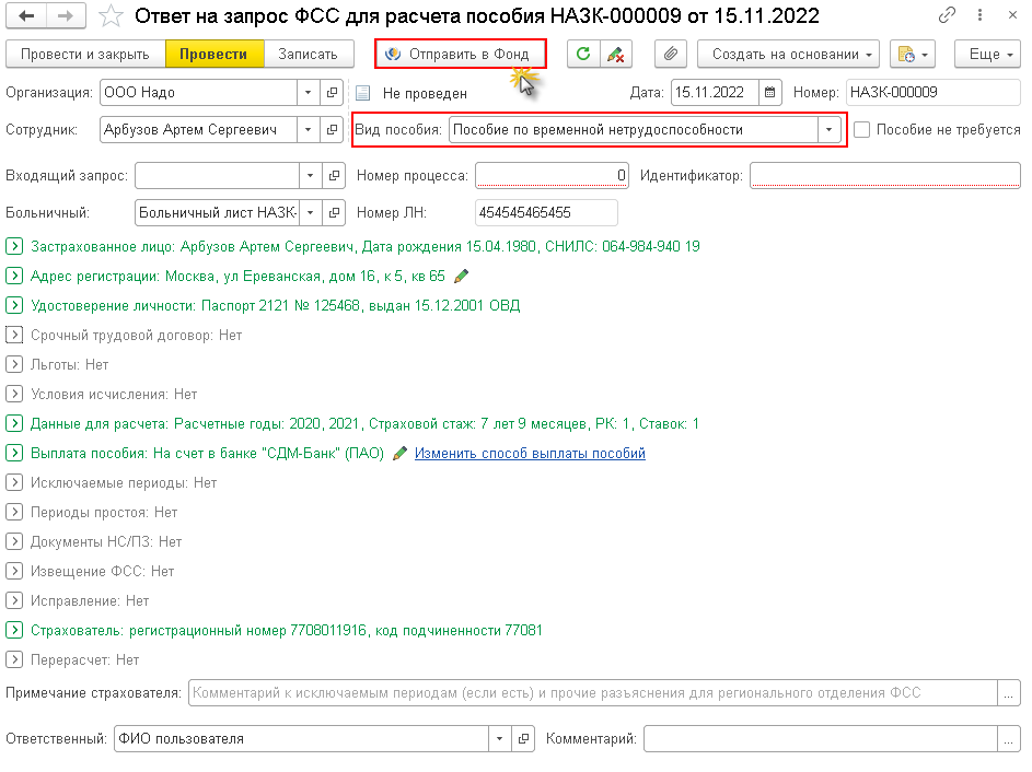 3. Следующий пункт действий – это создание ответа на прошение ФСС РФ – регистрируем документ «Ответ на запрос ФСС для расчёта пособия». Внутри строки «Вид пособия» нужно указать «Пособие по временной нетрудоспособности». Кликаем на «Отправить в Фонд». Теперь, ФСС РФ должно выплатить данное пособие за десять дней, рабочих, после получения данных от наймодателя. Эти действия демонстрируются на скриншоте с примером ниже: