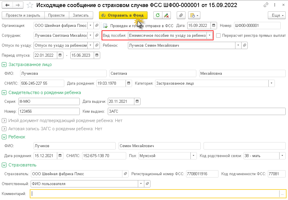 5. Следующий шаг – это создание документа «Исходящее сообщение о страховом случае ФСС», он располагается внутри панели «Прямые выплаты ФСС 1С». Внутри графы «Вид пособия» обязательно нужно обозначить, что это «Пособие по уходу за ребёнком», остальные данные заполнит сама конфигурация 1С: ЗУП, основываясь на сведениях в документе «Отпуск по уходу за ребёнком». Следующий шаг – кликнуть на «Отправить в фонд». Эти действия демонстрируются на скриншоте с примером ниже: